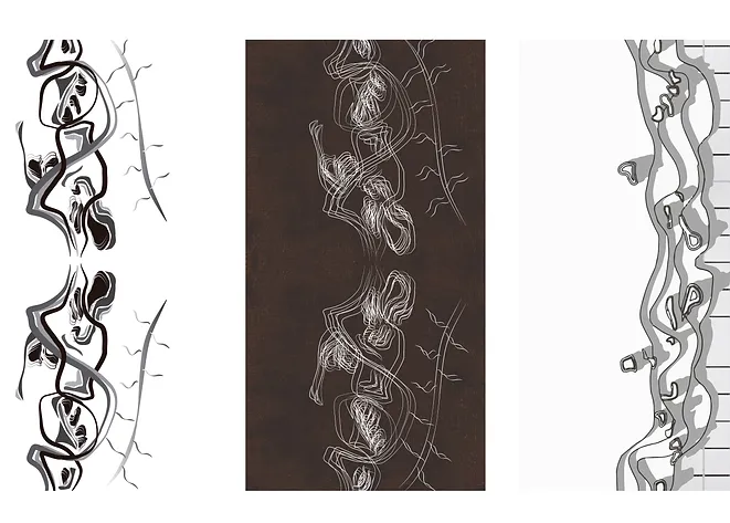 Es un estudio urbano artístico expresado en 5 diferentes capas: la de colores interpreta los vacíos, pasos peatonales, calles, ejes y directrices de la propuesta, la segunda los llenos y vacíos, la tercera la simplificación en líneas directrices, la cuarta la convierte en topografía  y la quinta la modula.
