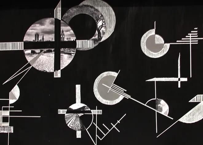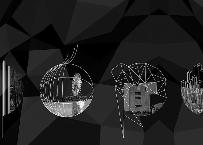 Composición cubista simétrica enfocada en la ciudad utópica centralizada. La ciudad conflictiva representada por sus curvas sinuosas y colores, es controlada por sus límites simétricos que conectan de manera proporcional la centralidad.
