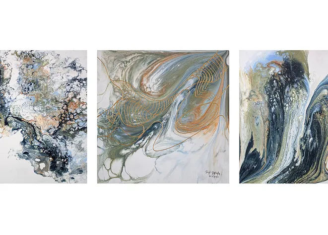 Pintura fluida acrílica sobre lienzo. Cada uno representa un estado de ánimo representado a manera de arte libre, que entre los tres generan un ciclo indeterminado.